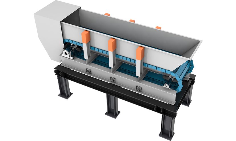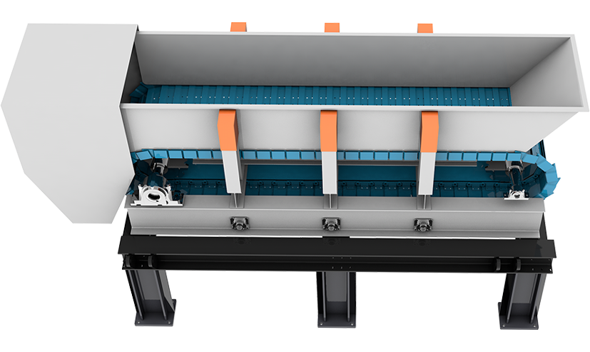 • Apron Feeder DMBL1238: The feed hopper is installed on the upper part and the discharge hopper on the front part; The frame shall have good rigidity and load-bearing capacity, and possess excellent resistance to instantaneous material impact.